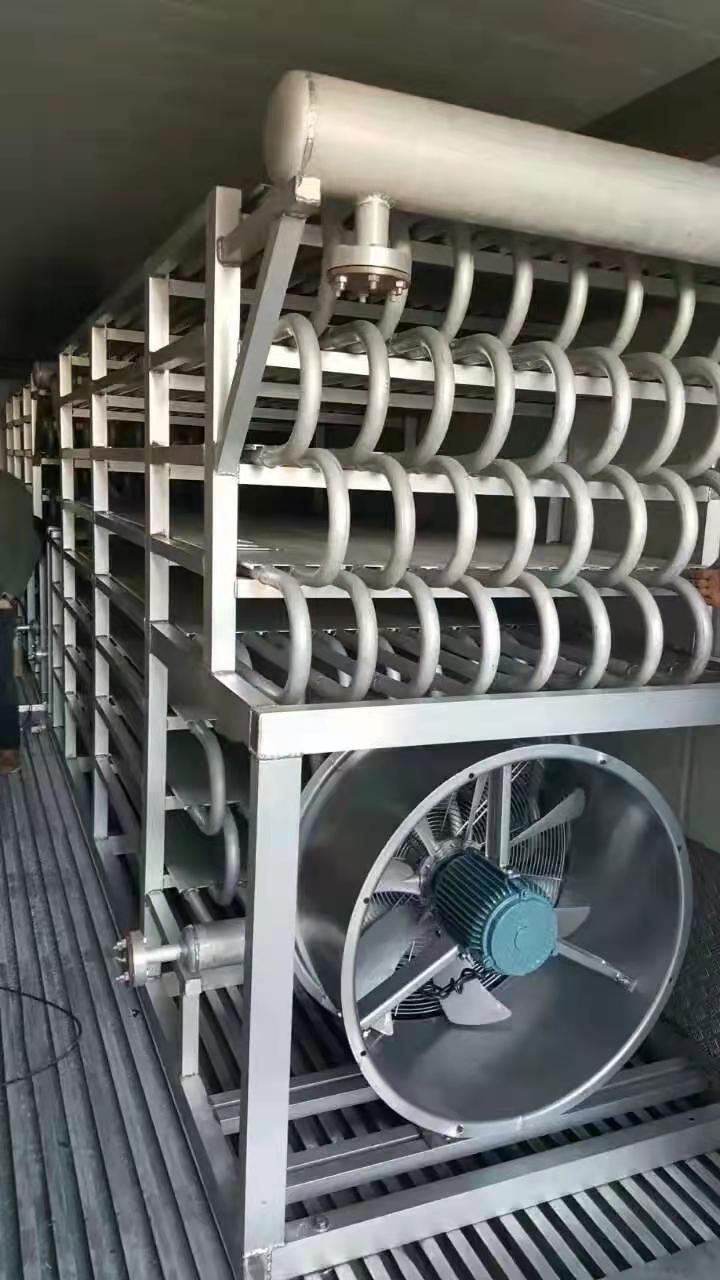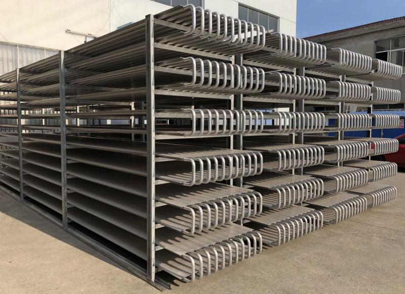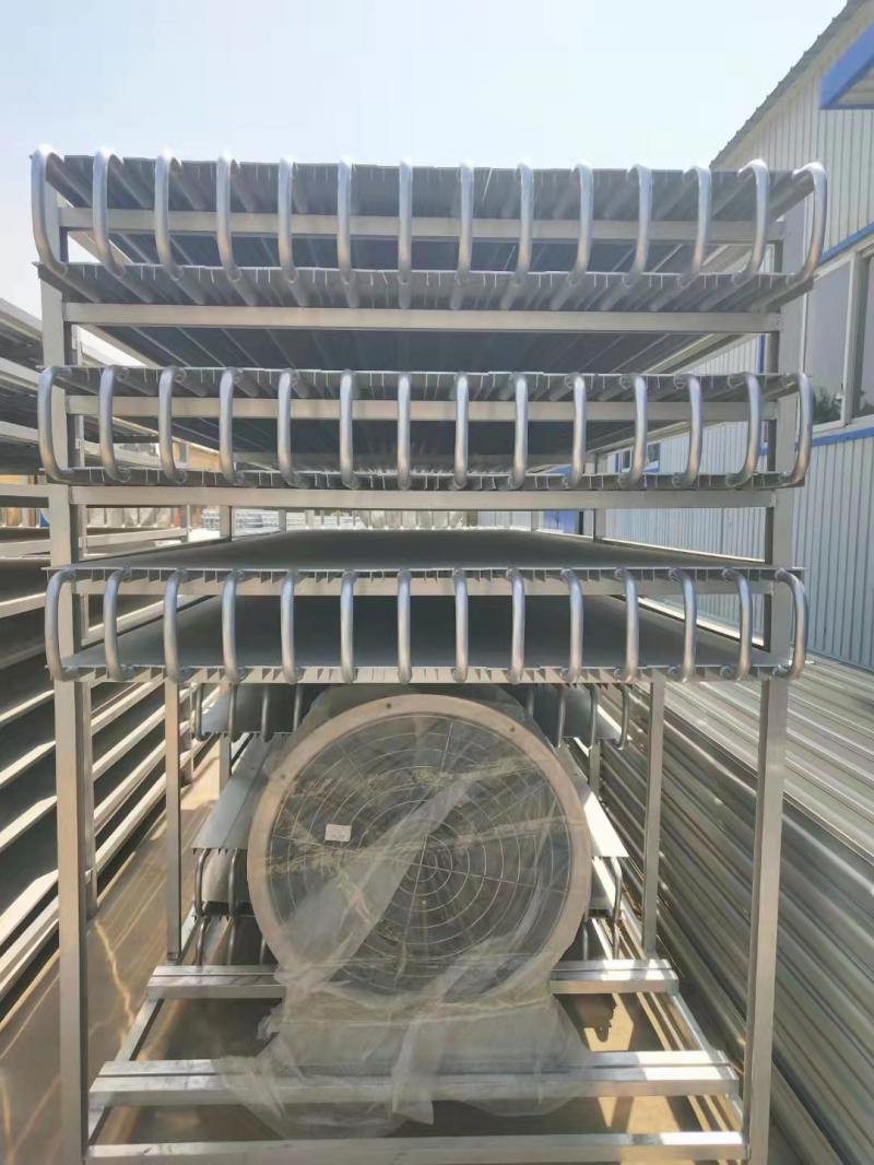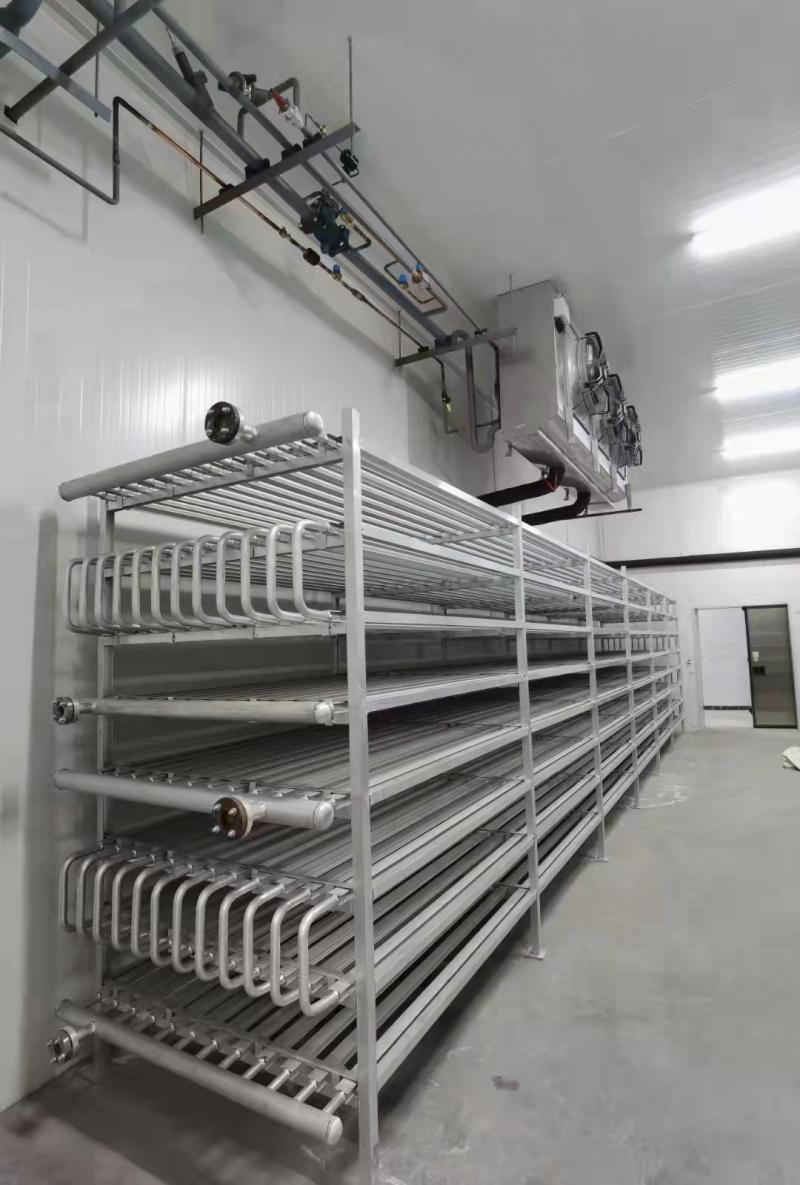 本實(shí)用新型公開了一種速凍間擱架,包括四根呈矩形排布的立柱,左右相鄰的兩根所述立柱之間穿插有連桿,前,后相鄰的兩根所述立柱之間穿插有第一連桿,所述連桿的外壁處開設(shè)有穿過(guò)所述第一連桿的孔,所述第一連桿的外部處焊接有擋板,所述擋板限位在所述立柱的內(nèi)側(cè),所述第一連桿穿過(guò)所述立柱的那一端螺紋連接有一螺母,在前,后設(shè)置的兩根所述立柱之間裝配有排架,所述排架上,下等距設(shè)置有多個(gè),在所述排架的側(cè)面橫向貫穿設(shè)置有多個(gè)安裝孔,還包括U字形的銅制的導(dǎo)冷管,所述導(dǎo)冷管的兩端穿過(guò)兩側(cè)的排架;本產(chǎn)品可以利用冷媒直接與被速凍的食品接觸,增加冷凍效率.